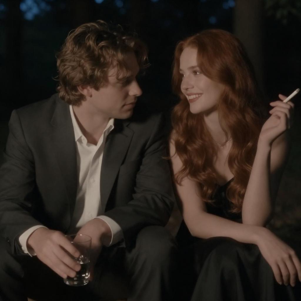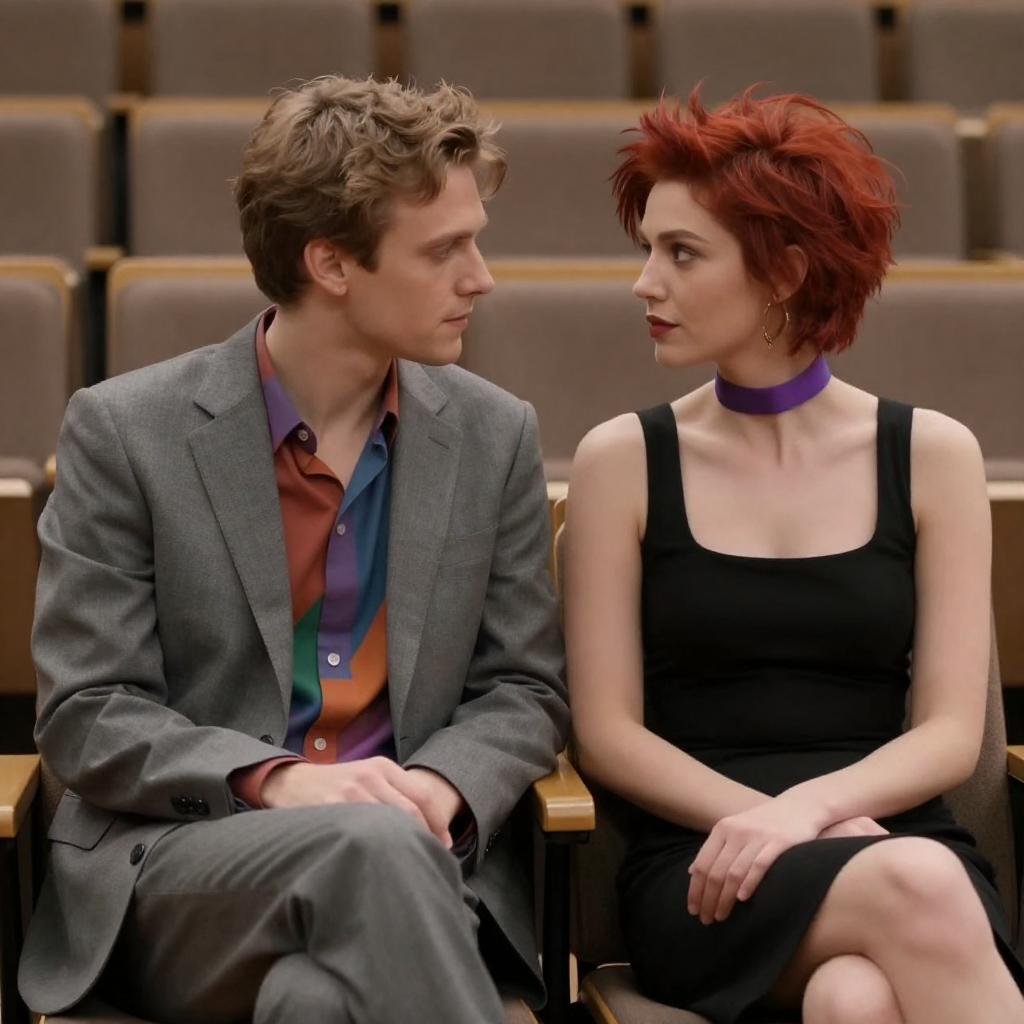 Photograph of a man and woman sitting close together in an auditorium. The man has light brown hair, wears a gray suit with a colorful shirt, and looks at the woman. The woman has red spiky hair, wears a black dress with a purple choker, and gazes back at him. Background features rows of empty seats.