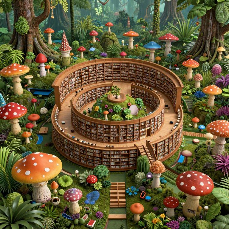 Neo uge library, microsized mushroom cities, books all over, Rainforest , Mandelbulb 3d, infinite plane, intricate, verdant, multicolored hyperrealist tarkovsky,