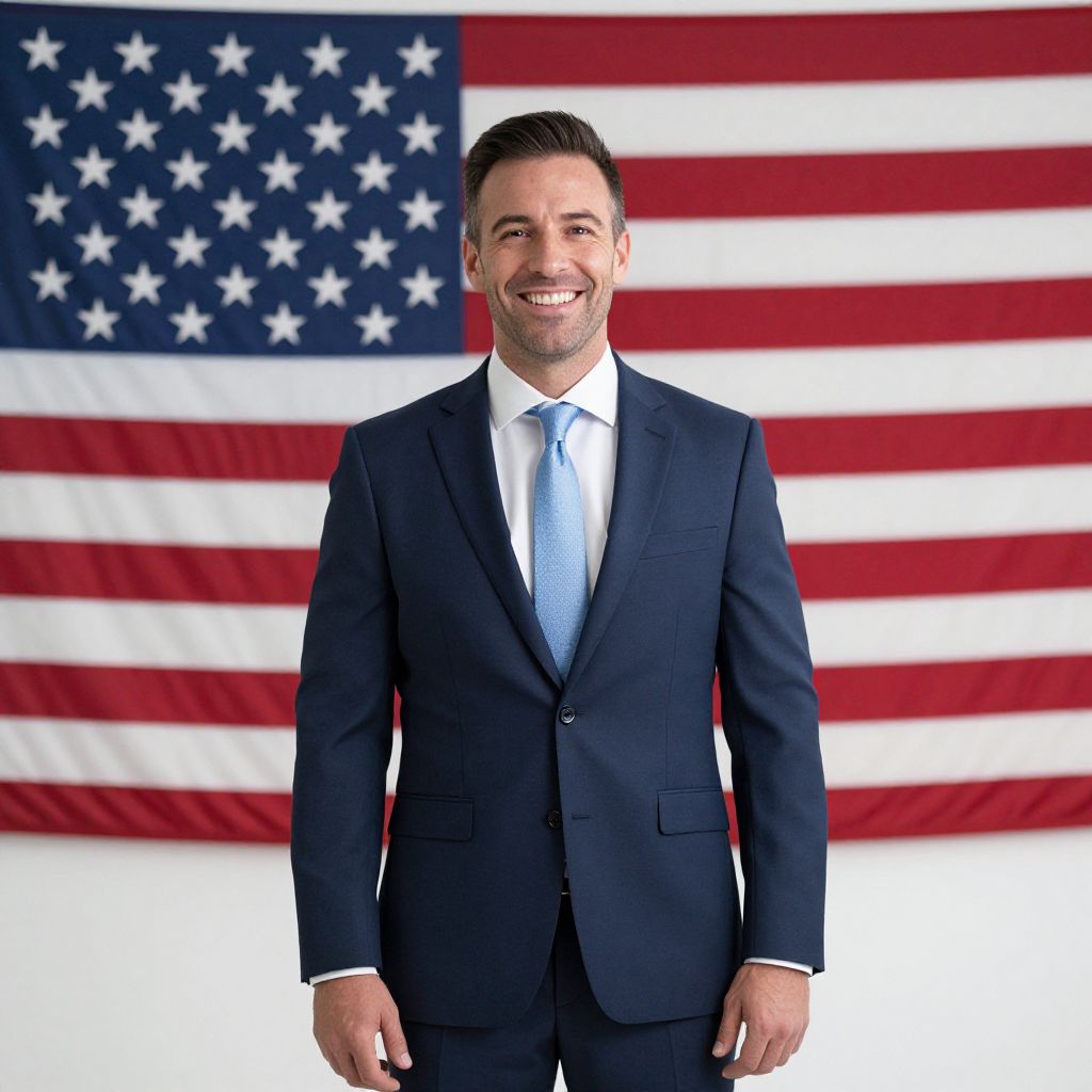 Photograph of a smiling Caucasian man with short brown hair and light stubble, wearing a dark navy blue suit with a white shirt and light blue tie. He stands against a large, prominently displayed American flag with red and white stripes and a blue field of white stars. The man's physique is average, and his skin tone is fair. The flag fills the background, with the top left corner featuring the flag's stars. The image has bright, even lighting, emphasizing the man's confident demeanor and the flag's vibrant colors.