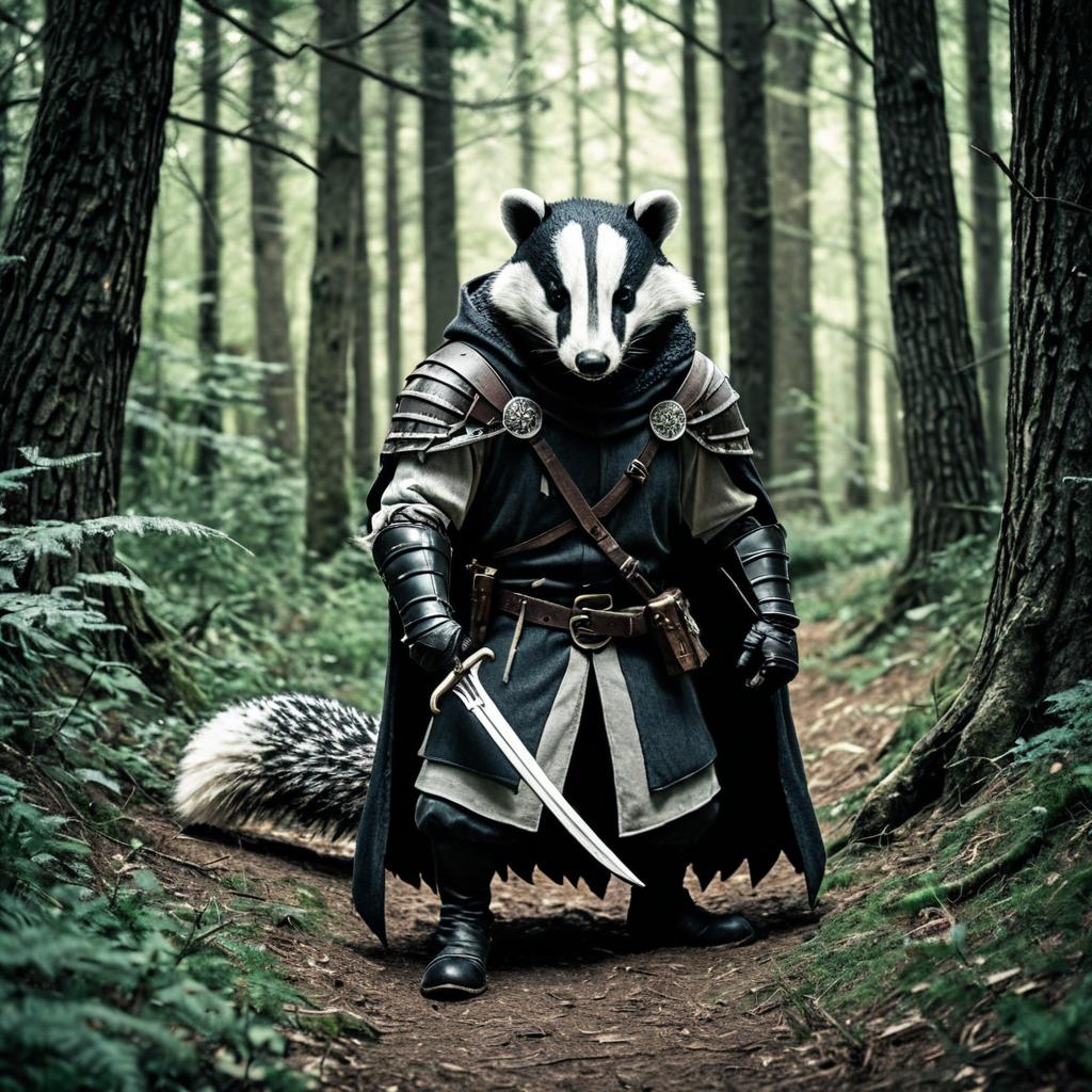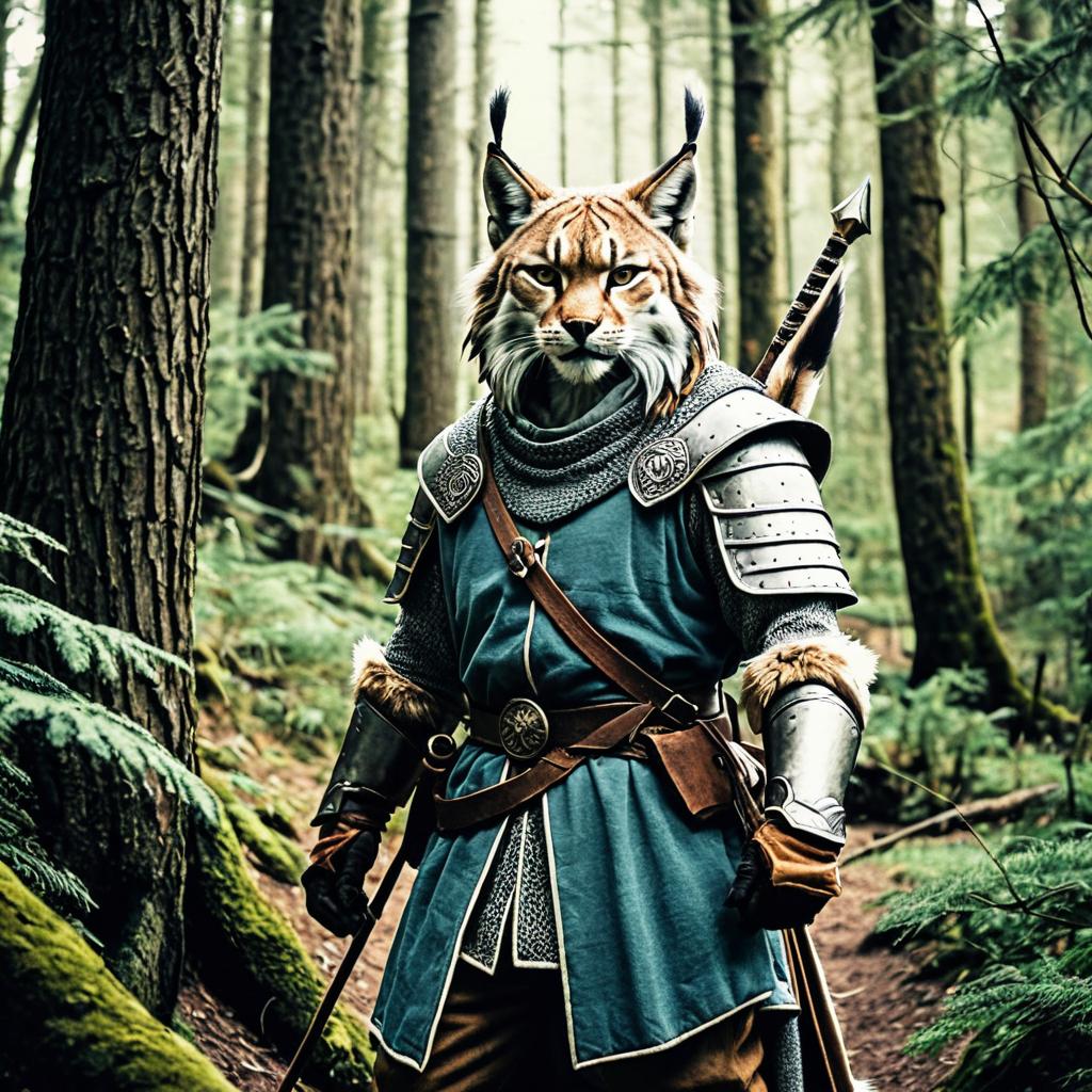 Illustration of a deer-headed humanoid warrior dressed in green and brown medieval armor with a cloak, carrying a staff and a quiver of arrows. The character stands on a forest path surrounded by tall, mystical trees with a green and luminous background.