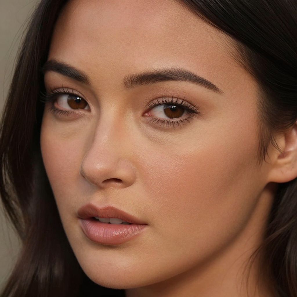 Photograph of a close-up, light-skinned woman with dark brown eyes, straight dark brown hair, and subtle makeup. Her eyebrows are well-groomed, and she has a natural, slightly glossy lip color. Her skin is smooth with a slight sheen, and she is looking slightly to the right with a neutral expression. The background is blurred and indistinct, keeping the focus on her face. The lighting is soft, highlighting her facial features evenly.