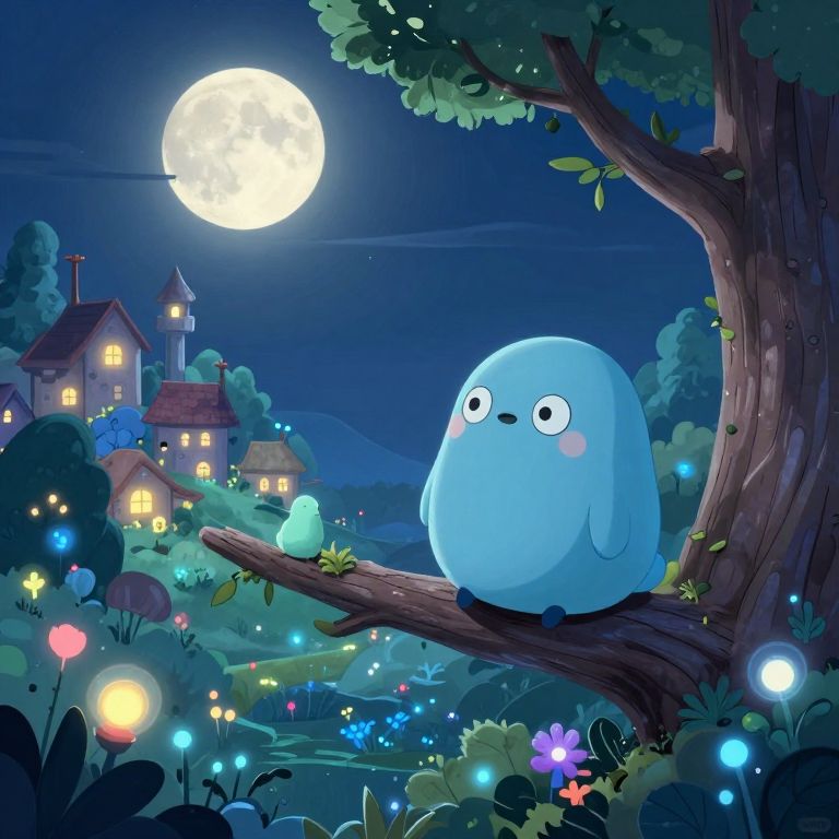 This digital illustration depicts a chubby, blue, round bird-like creature with small wings and wide, innocent eyes perched on a tree branch under a bright full moon. The background features a whimsical village with glowing windows, surrounded by dark blue, starry night sky and lush, illuminated foliage. The creature sits near a smaller, similarly glowing bird on the branch. Multicolored fairy lights dot the foreground, enhancing the magical, dreamlike atmosphere. The style is vibrant and cartoonish, with smooth textures and a playful, enchanting mood.