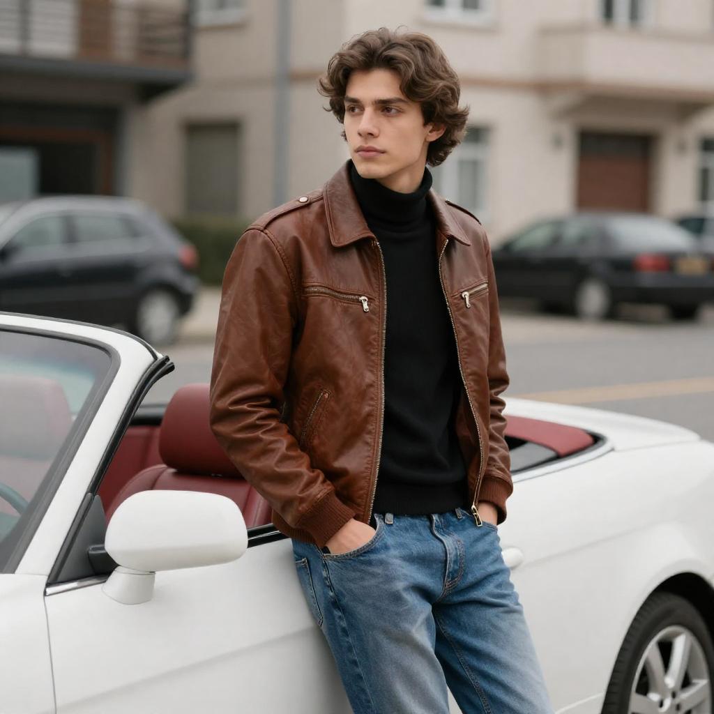Photograph of a confident man with a beard, wearing a beige jacket, white shirt, and brown pants, leaning against a green vintage car on a city street. Background includes a yellow car, buildings, and trees under a bright sky.