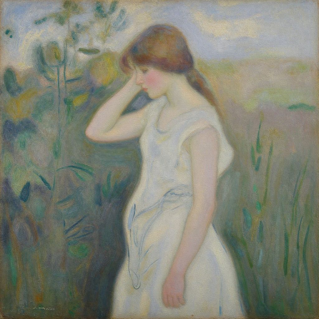 Impressionist painting of a fair-skinned, brown-haired woman in a white dress, touching her forehead, standing in a grassy field with tall