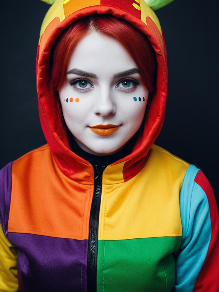 Studio portrait of a person wearing a colorful Skittles-inspired costume with a hood featuring yellow, orange, and red shades. The individual has green hair with bangs and is dressed in a white outfit with red accents on the sleeves. The photo is highly detailed and photorealistic with a dark background.