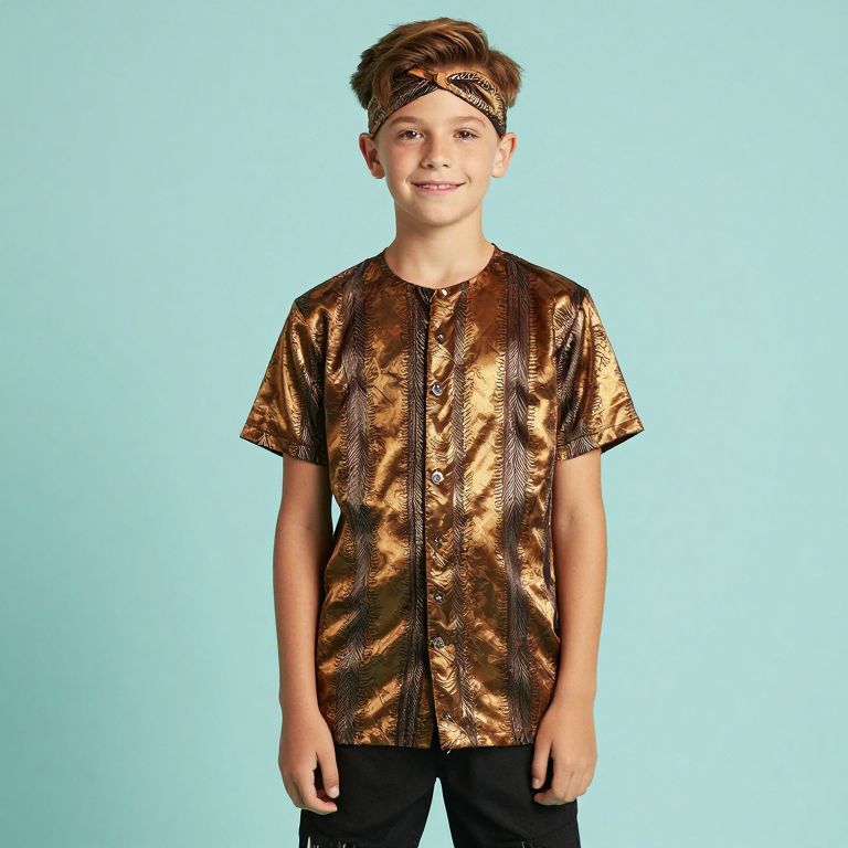 Photograph of a young boy with light skin and brown, slightly messy hair, wearing a gold, metallic, short-sleeved shirt with vertical black stripes and black pants. He has a black headband with a crisscross pattern on his forehead and is smiling gently. The background is a solid, bright turquoise color. The boy stands centered, facing the camera, with his arms relaxed by his sides. The metallic texture of the shirt reflects light, adding a shiny effect to the image.