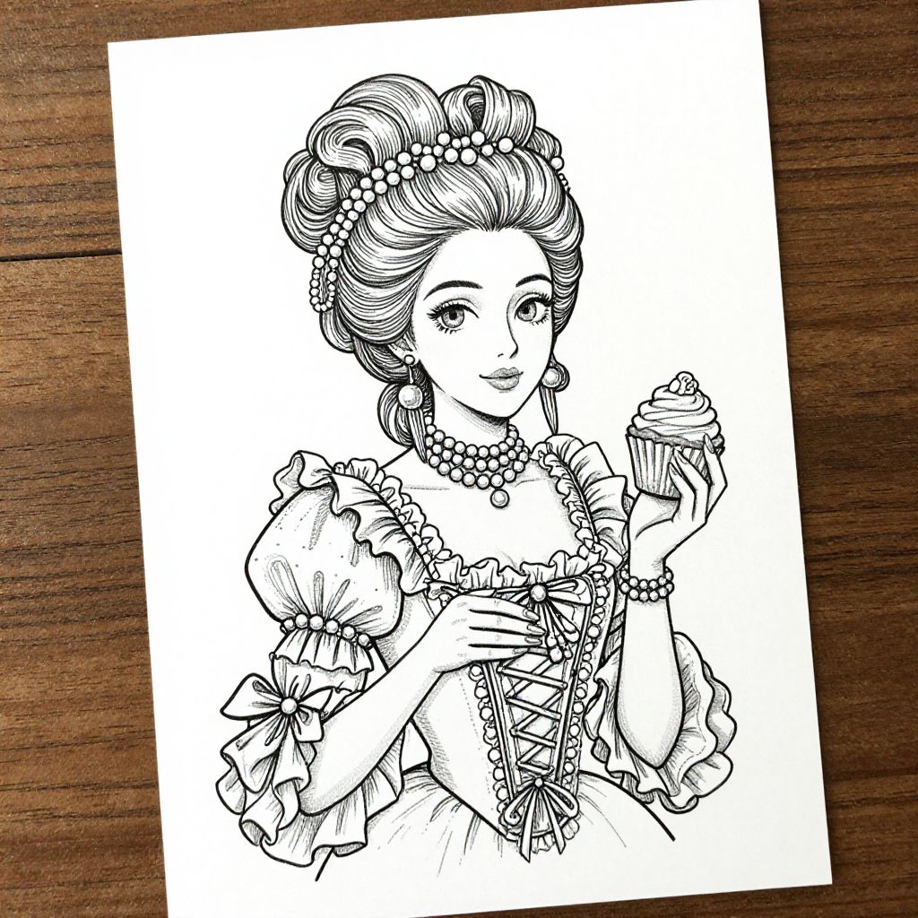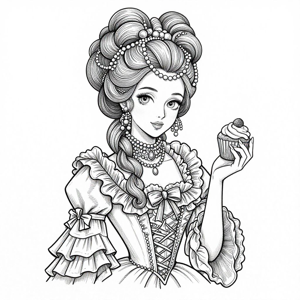 A detailed line art illustration in a Rococo-inspired fantasy style depicts a woman with elaborate big hair adorned with pearls, wearing a ruffled dress and holding a cupcake, rendered in black-and-white digital art by Mitzi Sato-Wiuff, ideal for cards and crafts.
