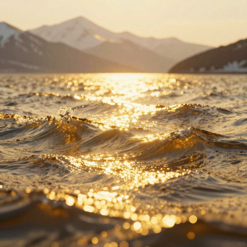 This image is a digital CGI artwork featuring a golden, sparkling ocean with gentle waves. The sunlight creates a shimmering effect, with bokeh-like light spots scattered across the water. In the background, there are blurred, snowy mountain peaks. The warm, golden hues dominate the foreground, contrasting with the cooler tones of the mountains. The overall scene feels serene and magical.