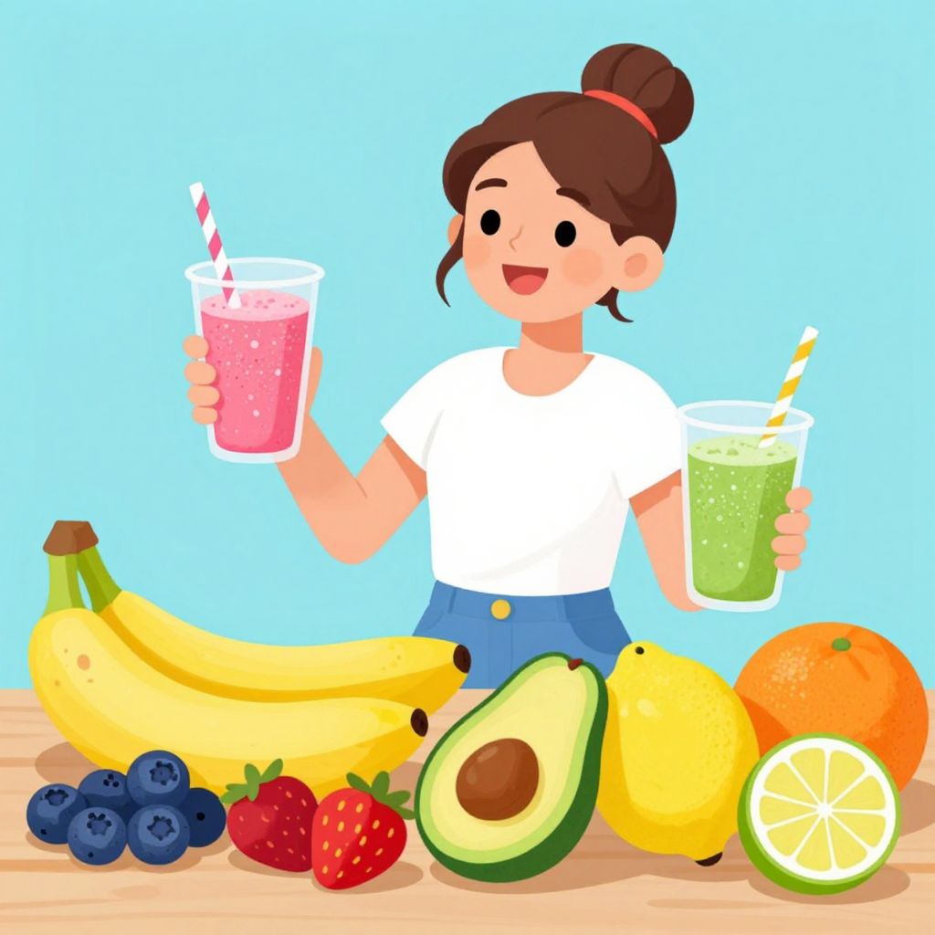 Digital illustration of a smiling woman with brown hair in a bun, wearing a white t-shirt and blue pants, holding a pink and green smoothie in each hand. She stands against a light blue background. In front of her on a wooden surface are two bananas, a halved avocado with a brown pit, blueberries, strawberries, a yellow bell pepper, an orange, and a sliced lime. Each smoothie has a striped straw. The style is vibrant and cartoon-like, with bold colors and simple, clean lines.