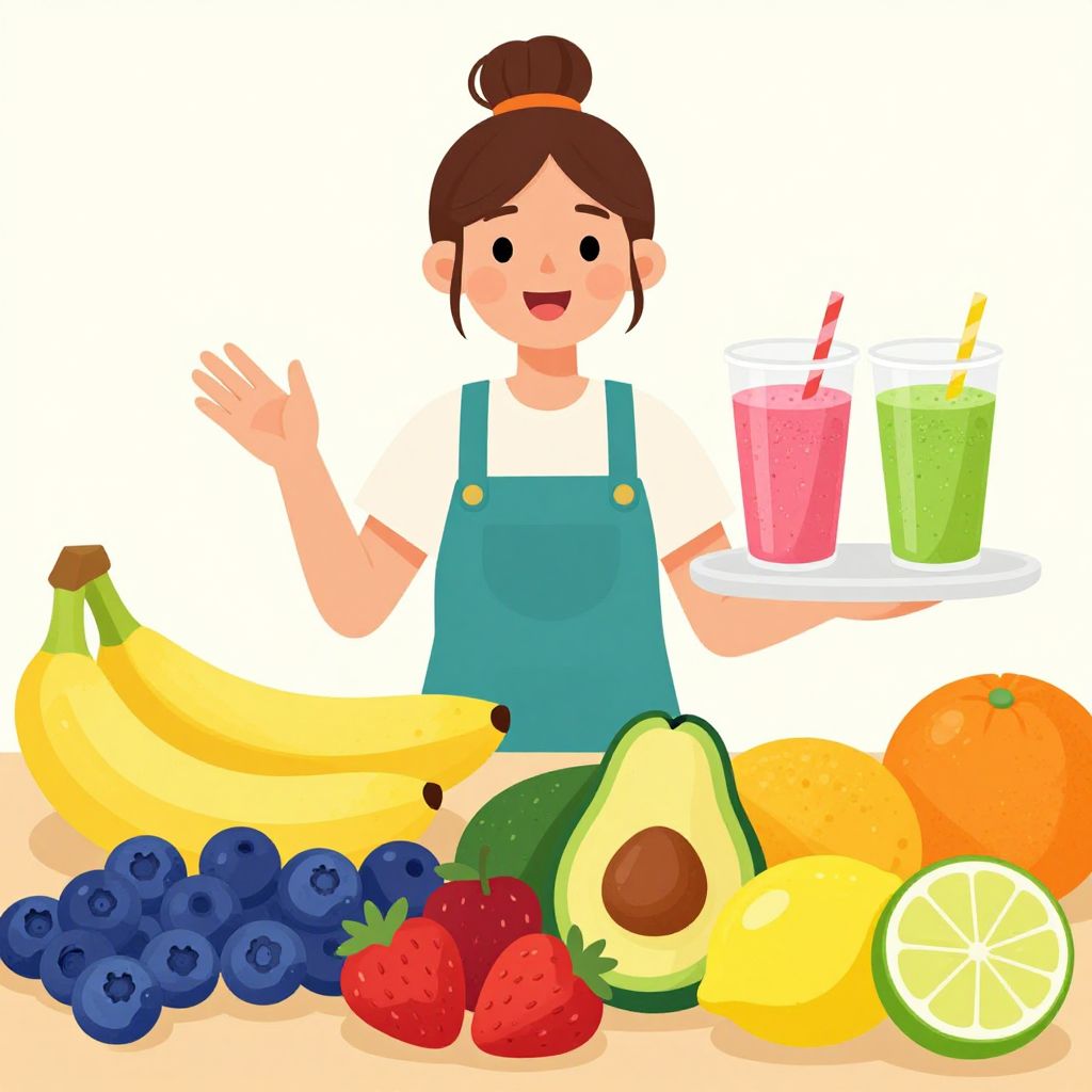 Cheerful cartoon woman with brown hair styled in a bun stands behind a vibrant display of fresh fruits, including two bananas, a cluster of blueberries, two strawberries, half an avocado, a lemon, an orange, and a halved lime, while serving two colorful smoothies—one pink and one green—each with a striped straw, exuding a lively and healthy atmosphere.
