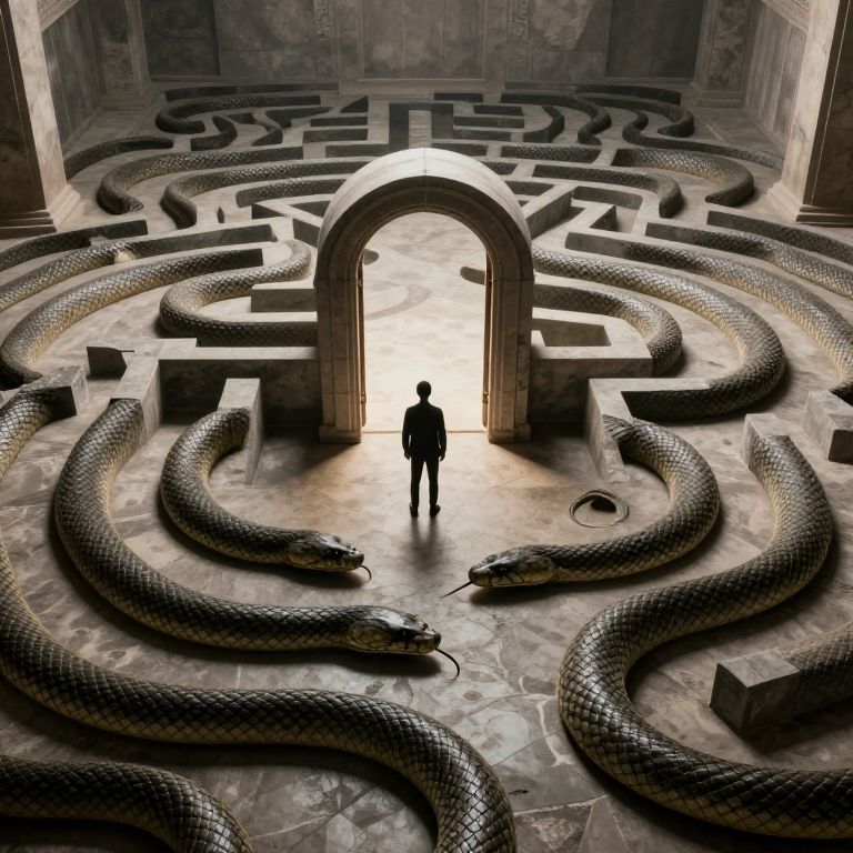 Photorealistic digital artwork depicting a silhouetted figure standing in the center of a vast, stone labyrinth with multiple large, coiled snakes. The figure stands under a large, arching stone structure, with bright light streaming through from the background. The labyrinth's walls are intricately carved, and the snakes, with textured, dark brown scales, surround the figure in a semi-circle. The stone floor is patterned with geometric shapes, adding to the maze's complexity. The overall atmosphere is mysterious and slightly ominous, with high contrast between the dark labyrinth and the bright, glowing archway.
