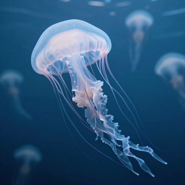 Photograph of a glowing, translucent jellyfish with delicate, flowing tentacles against a deep blue underwater background, surrounded by blurred, similarly glowing jellyfish