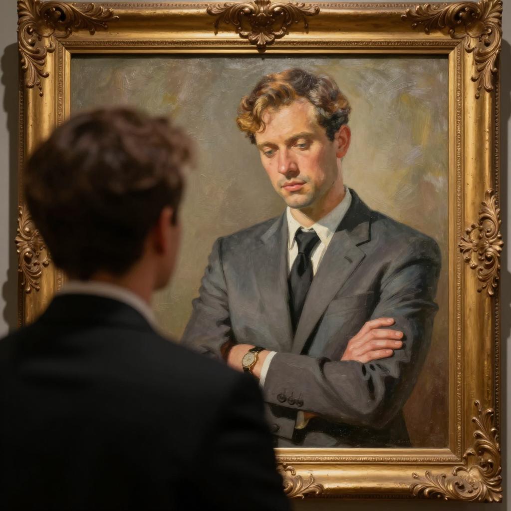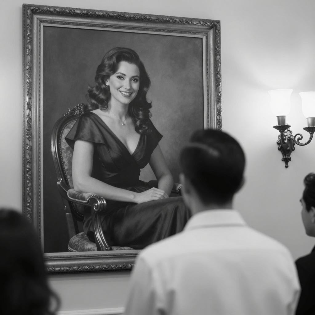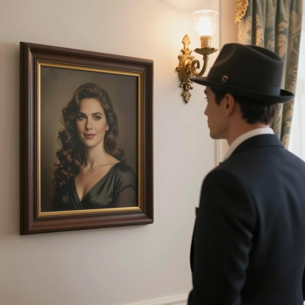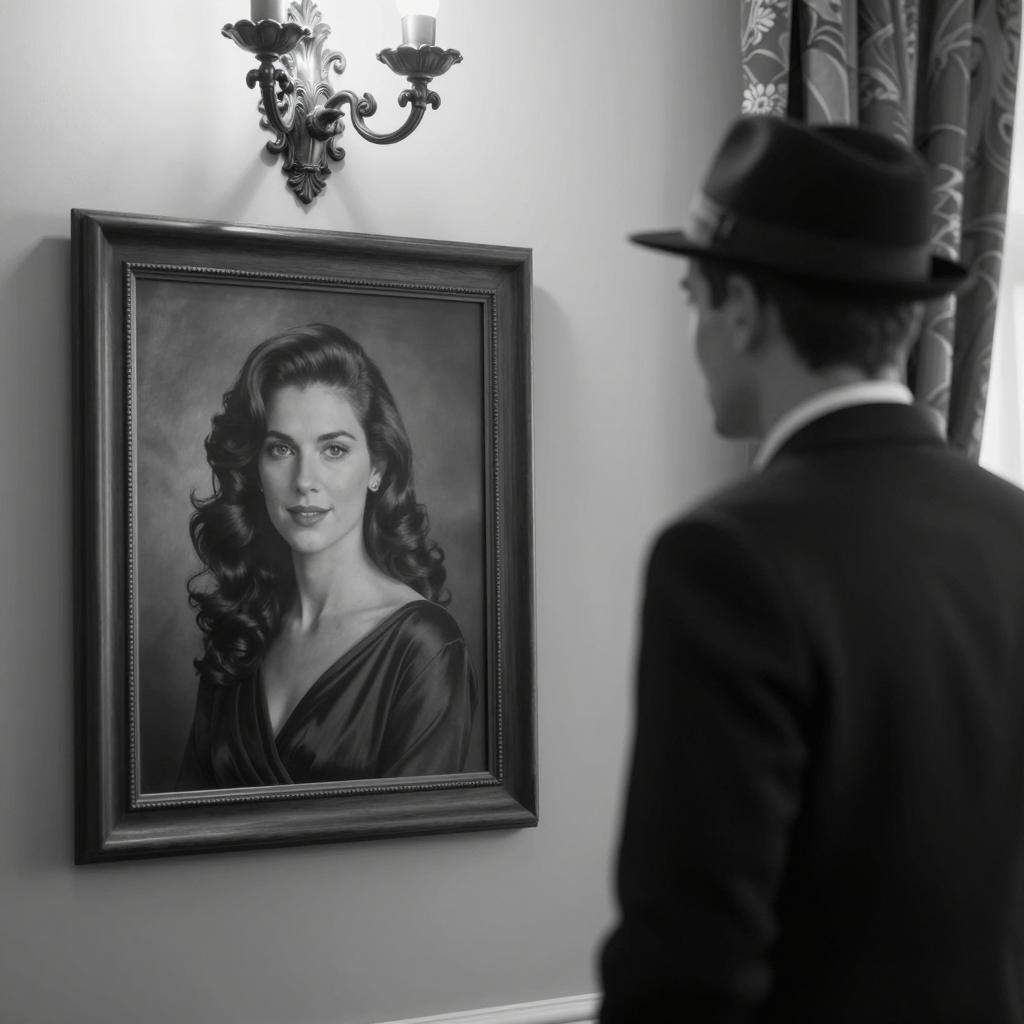 A man with slicked-back hair, wearing a white shirt, facing a large framed portrait of a woman with wavy hair, smiling, in a dark dress, sitting on an ornate chair. Wall sconce with a lamp on the right. Man's back to the camera. Two people. Woman's portrait on the left.