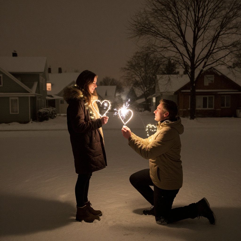 Romantic proposal unfolds under a snowy night sky as a man kneels, holding a heart-shaped sparkler, while a woman stands beside him, both enveloped by glowing hearts and warm lights against a backdrop of winter houses and bare trees.