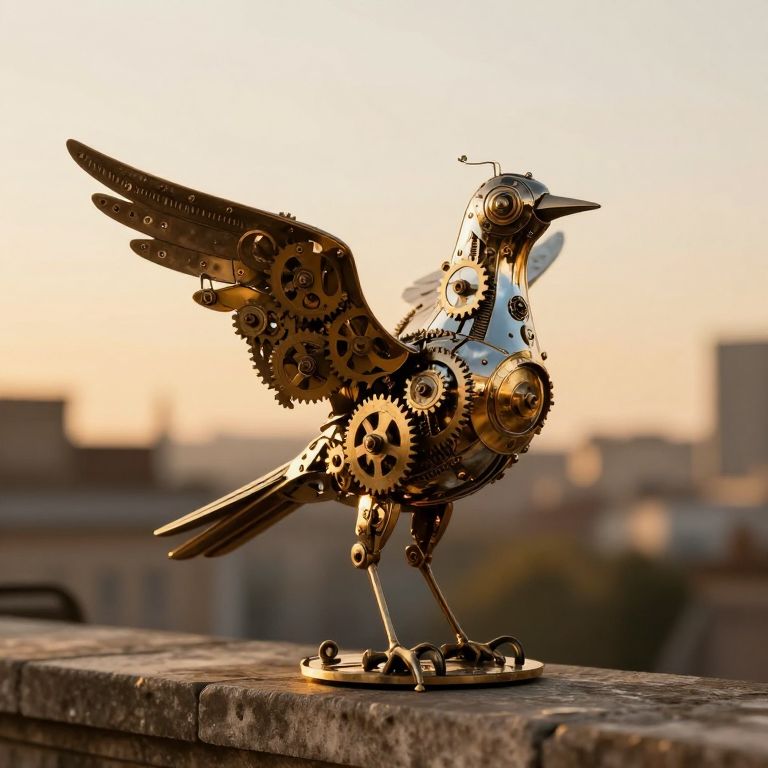A steampunk-inspired sculpture of intricately crafted clockwork birds, adorned with mismatched gears, cogs, and reflective surfaces, perches gracefully on a stone ledge as the golden hour bathes the scene in warm, nostalgic light.