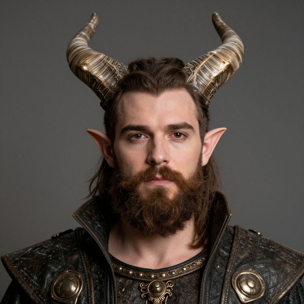 Morgus magnificent costume, beard, 1boy, solo, horns, male focus, facial hair, pointy ears, looking at viewer, closed mouth
