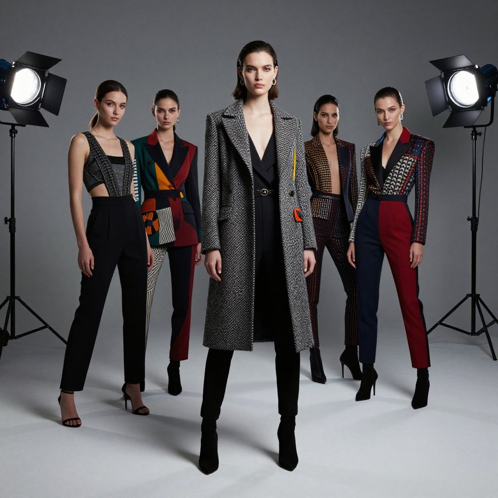A high-fashion photoshoot featuring top fashion style models in a sleek, minimalist studio, wearing avant-garde outfits with bold patterns and textures, lit by soft studio lights for a professional look.