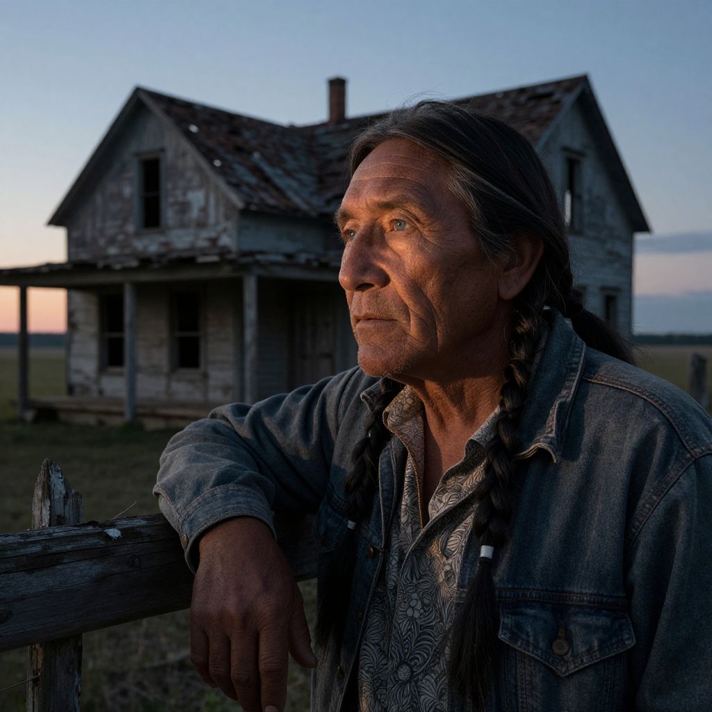 Photograph of an older Native American man with weathered, dark brown skin and long, braided gray hair. He wears a denim shirt over a patterned, button-up shirt, leaning on a wooden fence. His face is illuminated by the warm, golden light of the setting sun, highlighting his deep wrinkles and solemn expression. In the background, an old, dilapidated wooden house with a shingled roof stands against a twilight sky with hints of pink and blue. The house is slightly out of focus, emphasizing the man's contemplative presence. The scene evokes a sense of history and rustic solitude.