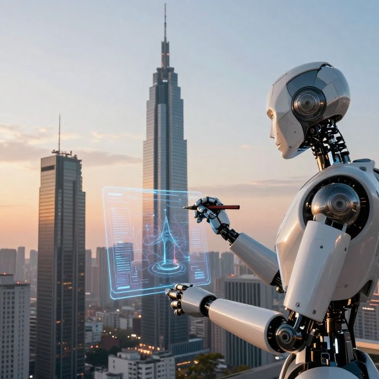 Photograph of a sleek, white humanoid robot with glowing blue eyes and joints, holding a tablet. The robot stands on a modern, two-story house with large glass windows, wood accents, and warm indoor lighting. The house features a clean, minimalistic design with a smooth, gray driveway and small green plants in the foreground. The robot is positioned in the foreground on the right, while the house occupies the background, creating a futuristic contrast between technology and modern architecture. The sky is clear with early evening light.