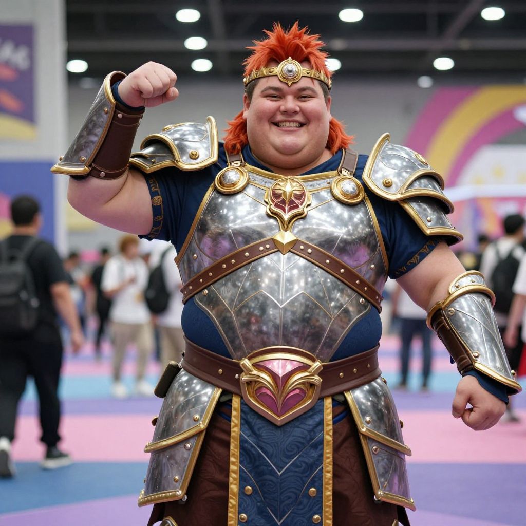 Cosplay for fat guys, featuring a cheerful plus-size man confidently dressed as a fantasy warrior, detailed armor adapting to his shape, vivid colors, vibrant convention background, dynamic pose highlighting strength and pride, intricate accessories, digital art style.