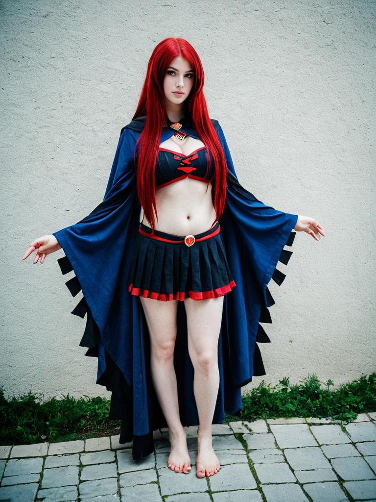 Photo-realistic cosplay photo of person in morgiana costume. Full body. Standing. Full length. 1girl, red eyes, red hair, long hair, medium breasts, feet, barefoot, one side up