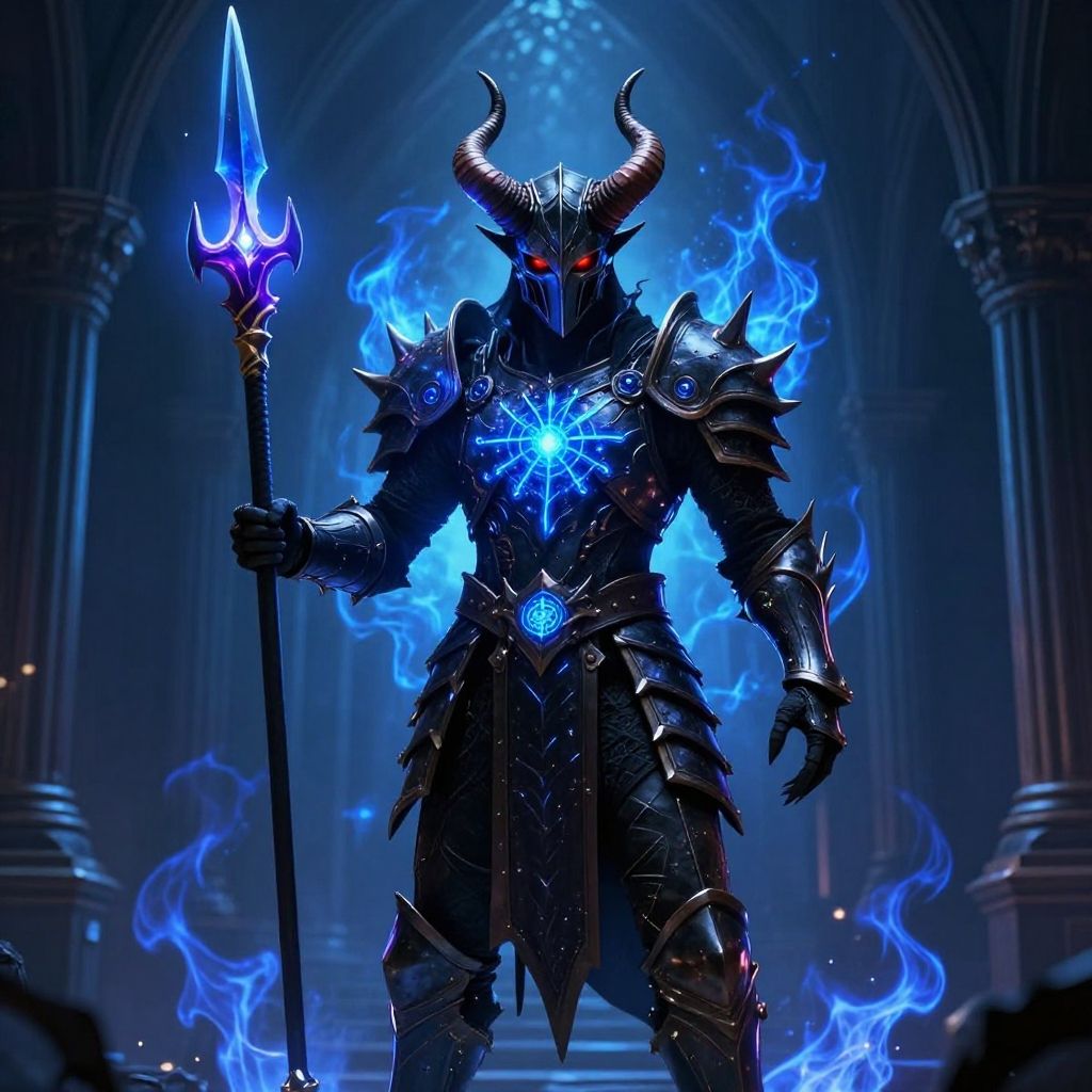 A menacing dark armored demon warrior stands in a gothic, arcaded setting, wielding a glowing blue and purple double-headed spear. The figure features horned helmet, spiked armor, and glowing red eyes with blue mystical symbols illuminated across its chest and waist. An ethereal blue flame-like aura glows behind the warrior, enhancing the fantasy and dark magic atmosphere.