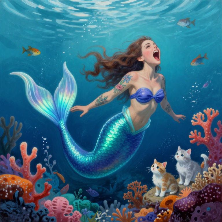 A mermaid with a bioluminescent tail and flower tattoos on her arms screaming into the oceanic void surrounded by colorful coral and sea kittens, painted by karol bak