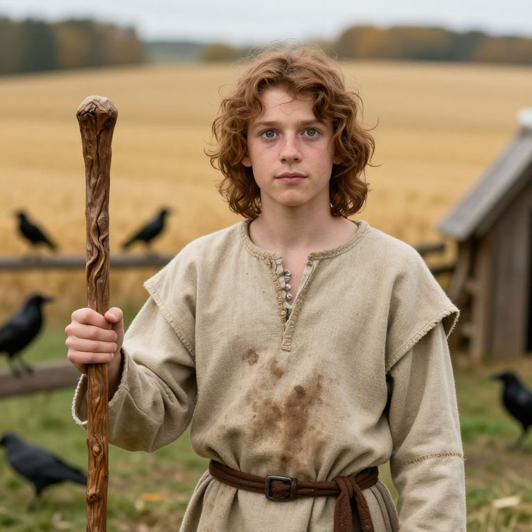 A realistic portrait of a young apprentice in a practical, everyday medieval tunic made of coarse hemp, standing outside a rural farmstead in early autumn, holding a wooden staff, her face young and eager with wide, curious eyes and wavy chestnut hair, the tunic stained slightly with earth and leaf patterns, the background showing scattered crows and a golden harvest field