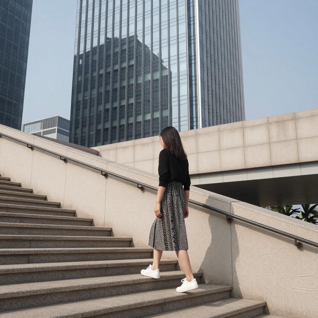A young woman standing with her back to the camera, raising her hands with a peace sign in front of a tall modern skyscraper on a sunny day, urban setting with clear blue sky, soft pastel color scheme, bright airy lighting, modern minimalism style