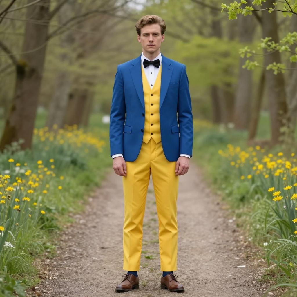 Adult boy fancy dress, photograph of handsome man in forest, wearing green suit, red and gold patterned vest, white shirt, red tie, pocket square, brown hair, standing in front of orange tree, stone wall in background, natural light, confident expression, full body shot, daytime, realistic style