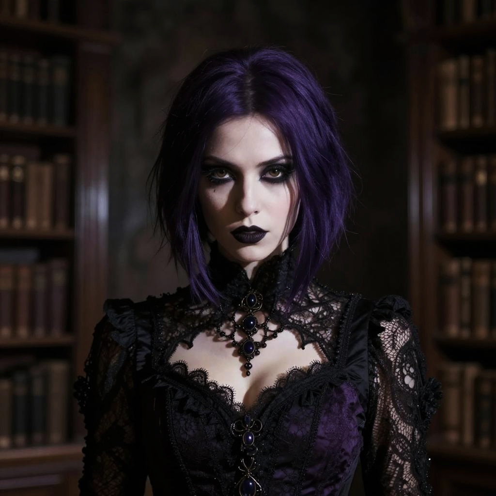 Dark purple short hair on a mysterious woman wearing gothic attire, dimly lit ancient library, smoky atmosphere, dramatic shadows, intricate lace details, intense gaze
