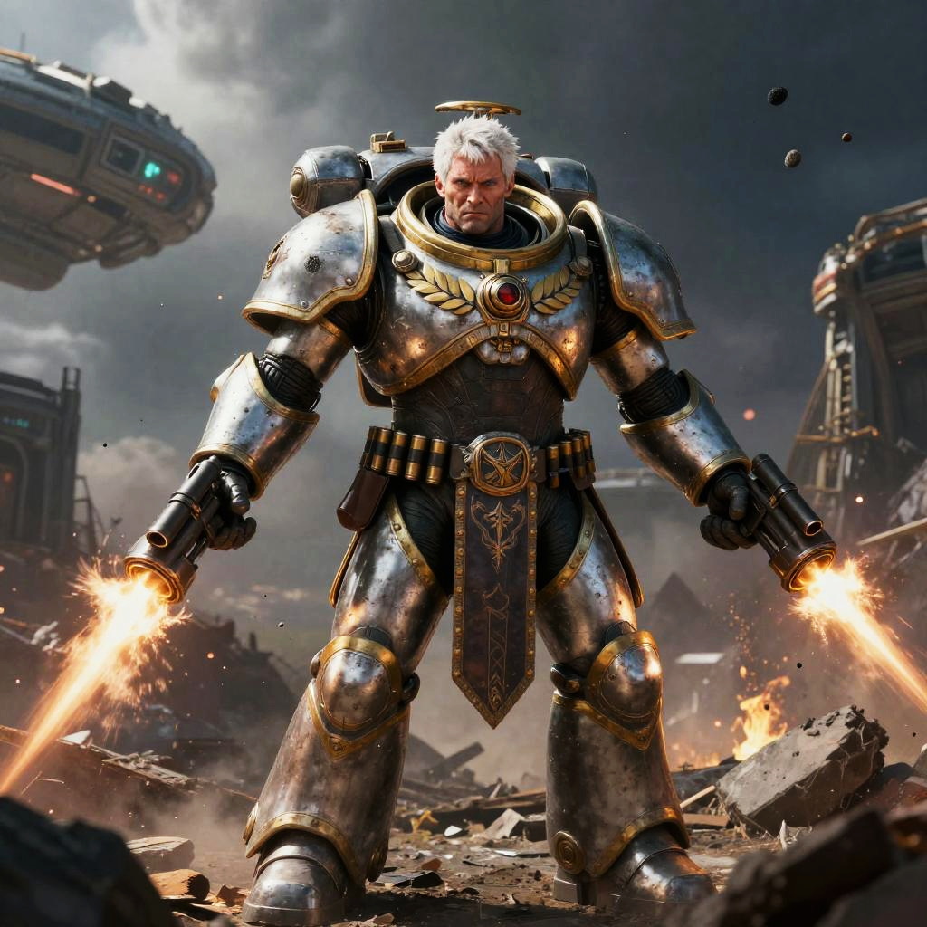Digital CGI illustration of a bald, muscular warrior in heavy, battle-worn, silver armor with a cross emblem on his shoulder and a winged chest plate. He wields two large, serrated swords, one in each hand, and is crouched in a battle stance. His face is contorted in a fierce expression. The background shows a dusty, sunlit street with blurred, armored figures and buildings. The armor is detailed with dark leather straps and metal accents, and the ground is covered in dirt and debris, enhancing the chaotic battlefield setting.
