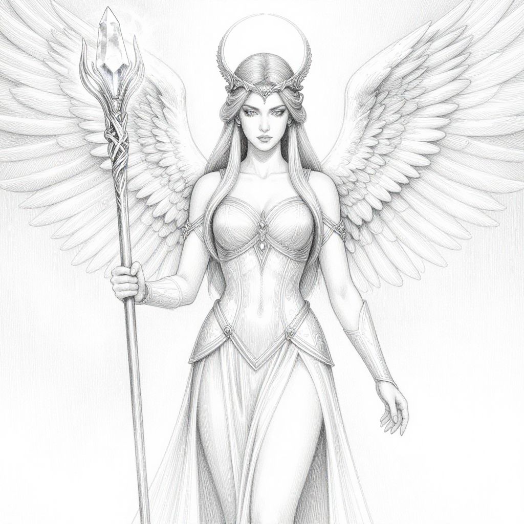 Female warrior angel drawing, serene yet formidable, her wings shimmering with light, adorned in elegant armor with ethereal fabrics, holding a staff topped with a glowing crystal, detailed line art with delicate hatching, mystical atmosphere blending strength and grace