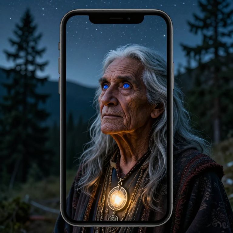Envision an iPhone portrait capturing the enigmatic allure of a Hispanic mystic, illuminated by an ethereal amulet's soft glow. The elderly subject, with weathered skin, piercing blue eyes, and flowing silver hair, gazes into the distance from a high-angle perspective that accentuates their otherworldly aura. Set against a serene landscape of majestic evergreens silhouetted beneath a starry sky, this contemporary fine art photograph evokes ancient wisdom and timeless wanderlust, inviting viewers on a journey through time and space to uncover forgotten secrets.