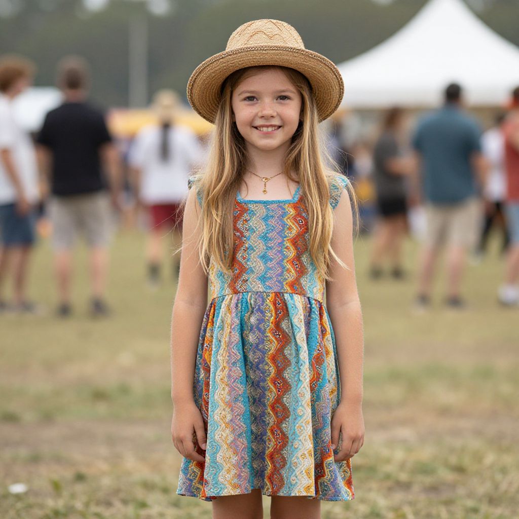 Photograph of a smiling young girl with long blonde hair, wearing a straw hat and colorful patterned dress, standing in a grassy outdoor festival field