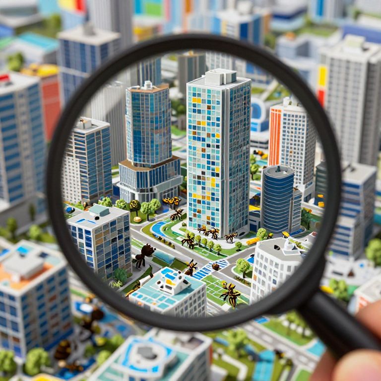 Photograph of a colorful, miniature cityscape viewed through a black magnifying glass. The magnifying glass focuses on a cluster of tall, modern skyscrapers with blue, gray, and white facades, interspersed with smaller buildings. The background shows a blurry mix of similar structures. Visible through the magnified lens are tiny trees, streets, and a blue swimming pool. The hand holding the magnifying glass is partially visible in the foreground. The image has vibrant, saturated colors and a playful, almost toy-like aesthetic, emphasizing the scale of the buildings and the magnifying effect.