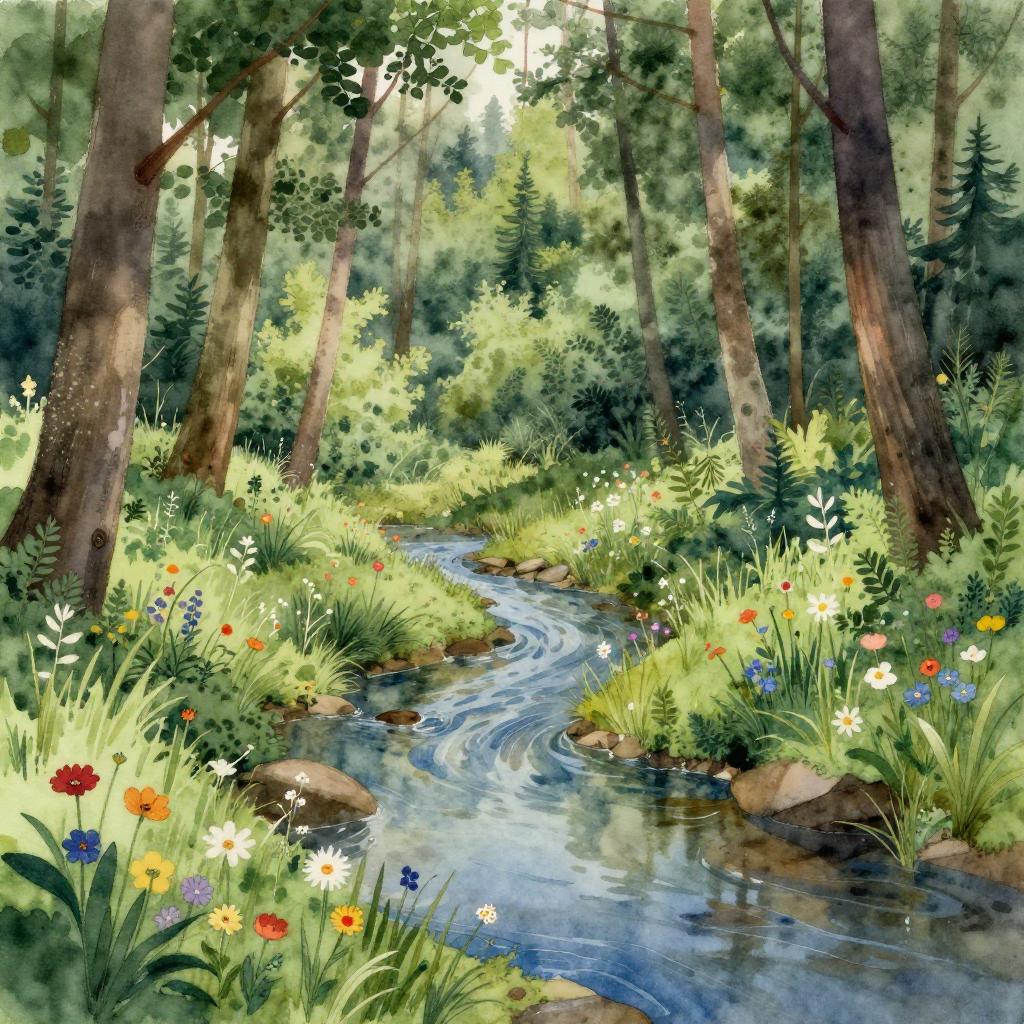 Watercolor painting of a forest scene at sunrise featuring tall trees, a gentle stream, and a soft earthy color palette with shades of green, brown, and orange, creating a tranquil natural atmosphere.