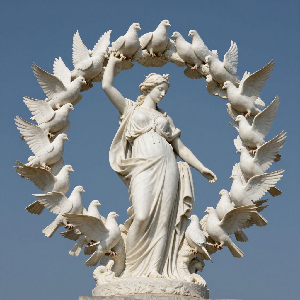 Photograph of a white marble statue of a robed female figure with raised arm, surrounded by 12 white pigeons in a circular formation against a