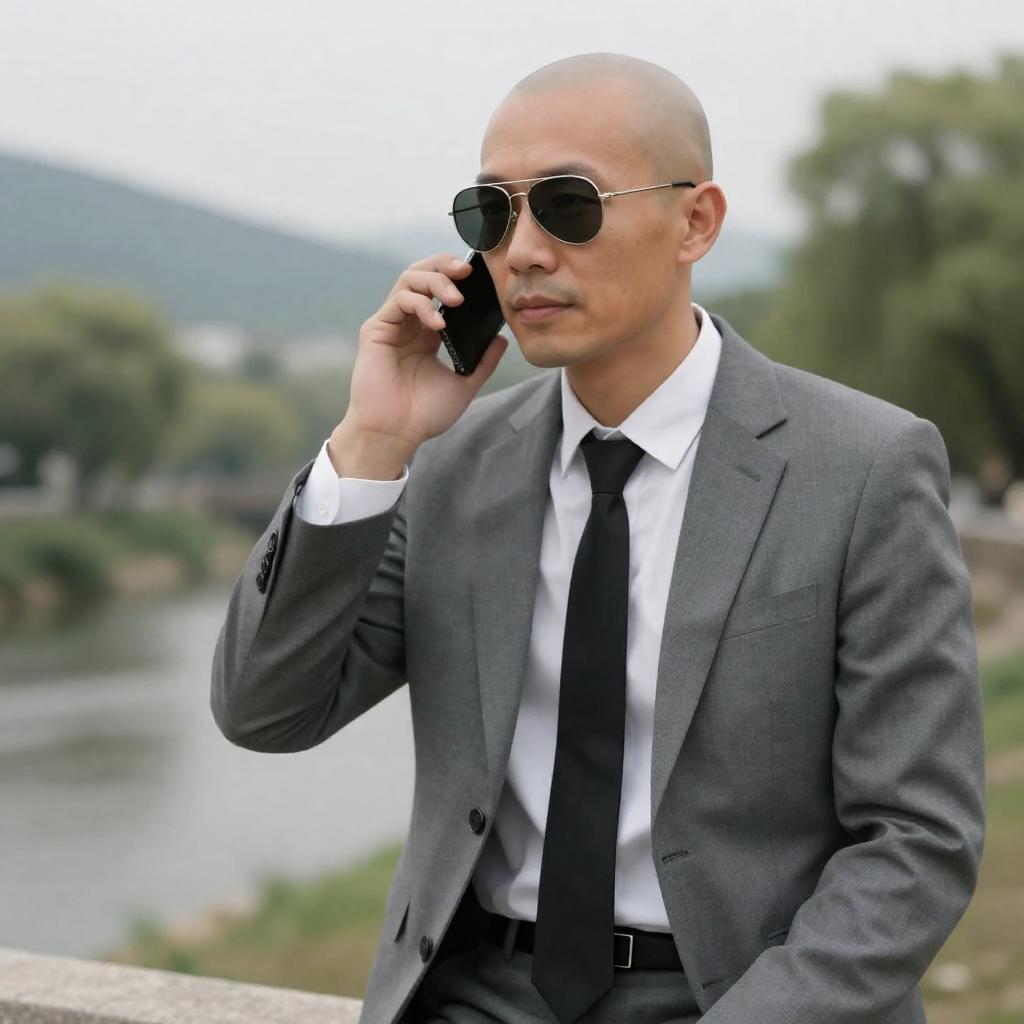 Bald man in gray suit, white shirt, black tie, and aviator sunglasses, holding phone to ear, sitting outdoors by a river. Background includes green trees, distant hills, and overcast sky. Man's expression is focused.