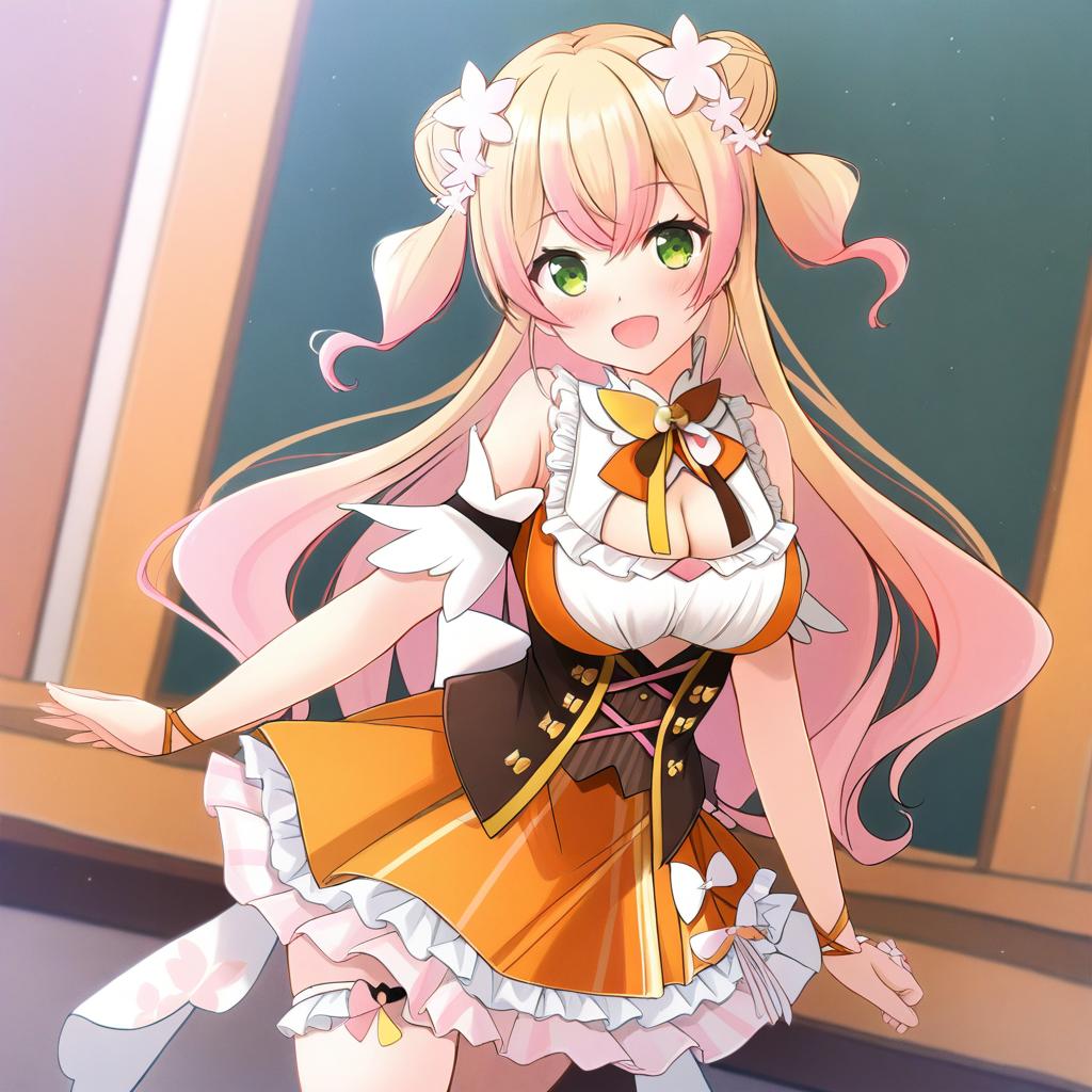Momosuzu nene (1st costume), hololive, 1girl, fang, green eyes, hair between eyes, blonde hair, long hair, gradient hair, pink hair, two side up, double bun, hair flower, large breasts, medium breasts, cleavage, cleavage cutout, cutout above navel, frilled shirt, orange shirt, orange skirt, frilled skirt, sleeveless shirt, multicolored bow, brown bowtie, orange bowtie, yellow bowtie, multicolored bowtie, bare shoulders, virtual youtuber, virtual youtuber, underbust, corset, by artist shibacha, animagine