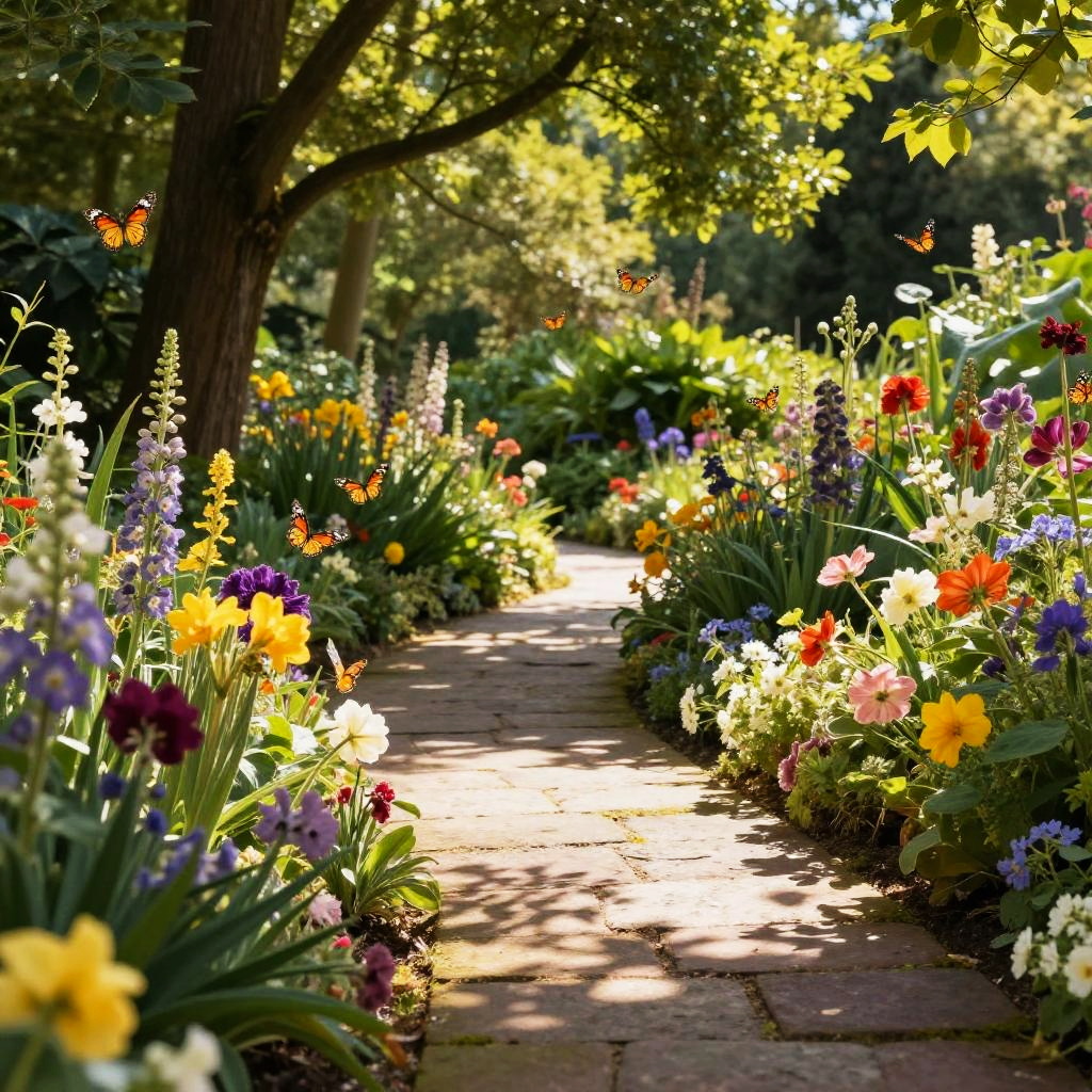 June botanical garden bursting with blooming flowers and thriving greenery, butterflies fluttering around vibrant blossoms, a stone pathway winding through tall trees, sunlight streaming through leaves creating playful shadows, a serene sanctuary of nature’s beauty.