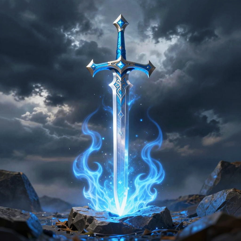 Light blue sword embedded in a stone surrounded by blue flames, set against a stormy sky background, fantasy epic style, high detail, glowing effects emphasizing magical power