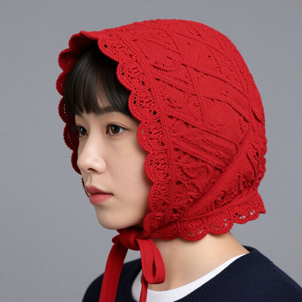 Photograph of an Asian woman with fair skin and straight black hair, wearing a bright red, hand-knitted, scalloped-edged, hooded hat that covers her ears. The hat is textured with ribbed patterns and a red ribbon tied at the chin. She has a neutral expression and is dressed in a black top with a white collar. The background is a simple, solid light gray, which makes the red hat stand out prominently. The woman is positioned in a three-quarter profile, facing left.