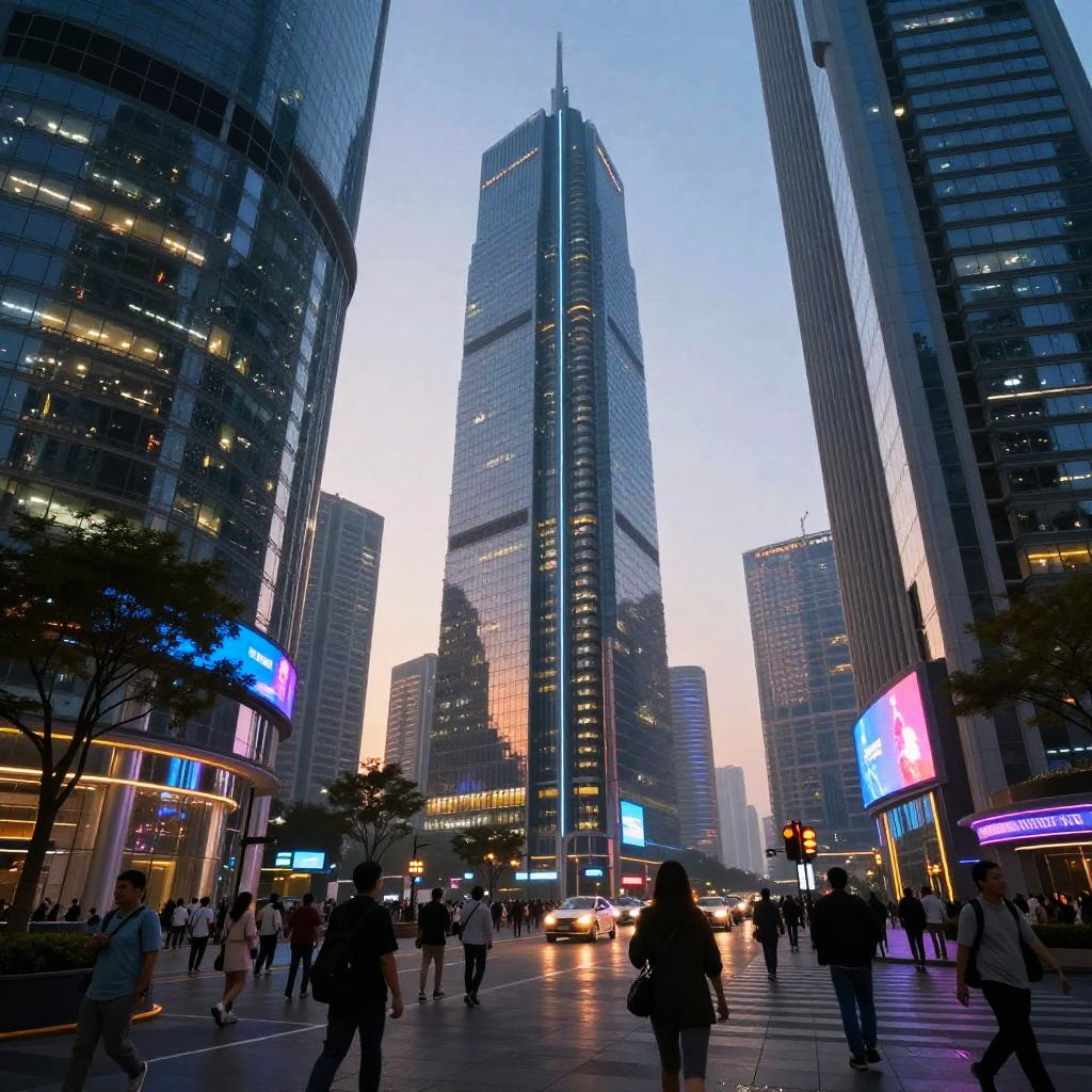 Lorem-inspired futuristic cityscape at dusk, neon lights reflecting on glass skyscrapers, bustling streets filled with diverse characters, cyberpunk aesthetic blended with modern architecture, deep shadows and vibrant highlights, cinematic perspective