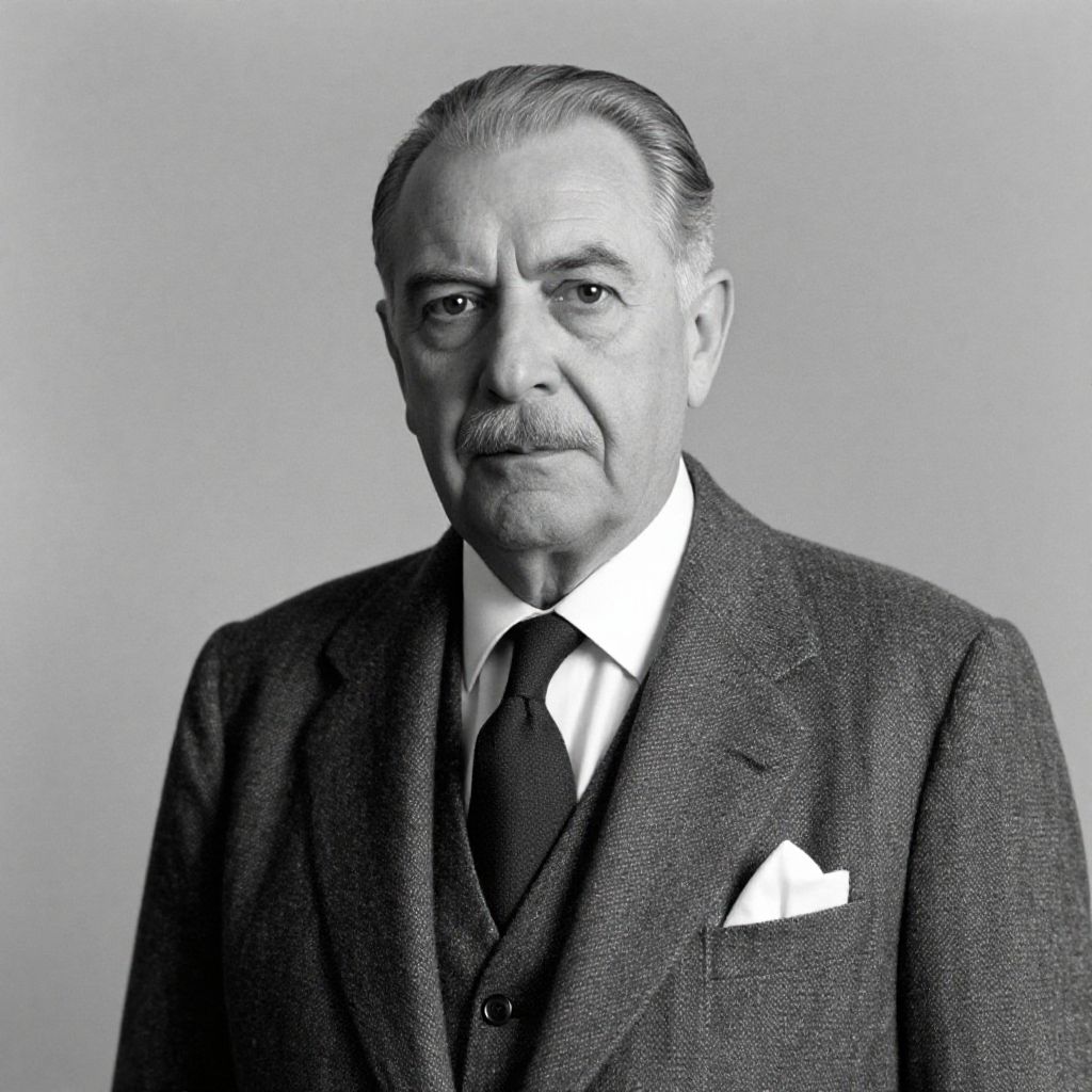 Photorealistic digital portrait of an elderly white man with gray hair, wearing a dark suit, white shirt, and striped tie, enclosed in a black