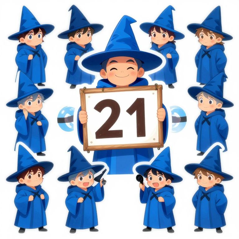 This digital illustration features a cluster of nine cartoon-style wizards with blue robes and matching hats, arranged around a central wizard holding a sign with the number "21" in bold brown text. The central wizard has a cheerful expression and blush on his cheeks, while the other wizards display various emotions and poses, including pointing, smiling, and looking surprised. The background is white, emphasizing the colorful characters. The wizards have light brown hair and large, expressive eyes, with a consistent cartoonish and vibrant art style. The illustration has a playful and whimsical feel.