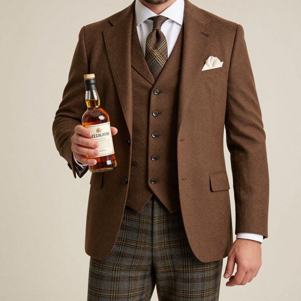 A man dressed in a sophisticated Scotch-themed costume, featuring a brown tailored jacket, matching waistcoat, and plaid trousers. He holds a bottle of Scotch whisky, embodying a refined and classic Scottish style with a modern twist.