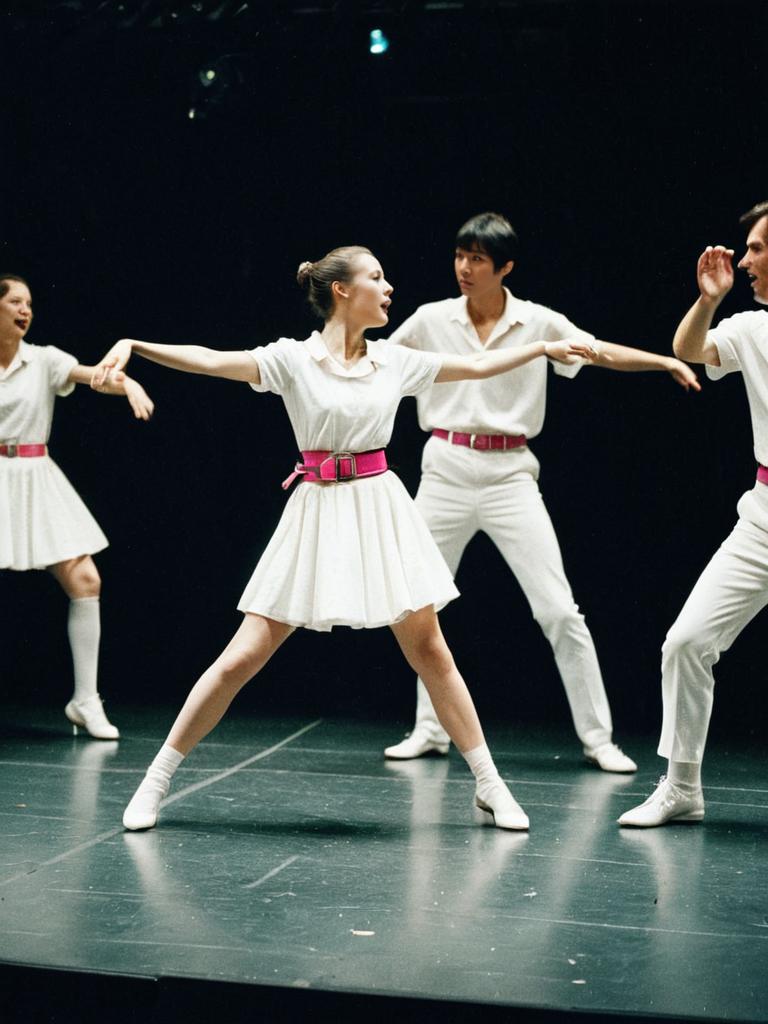 Stage Outfit Dancers, woman in white dress with pink belt and choke