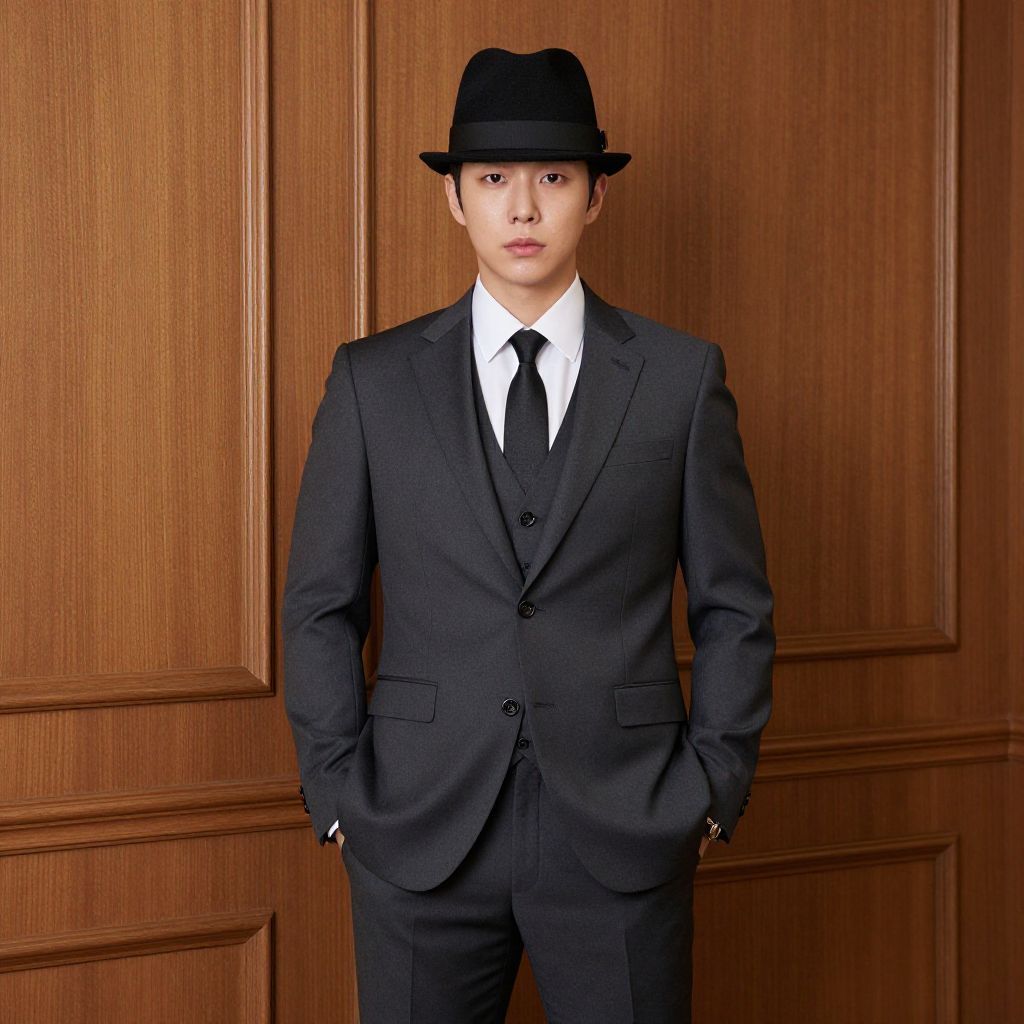 Mafia Outfit Korean Costume, man in a suit and hat standing in a room