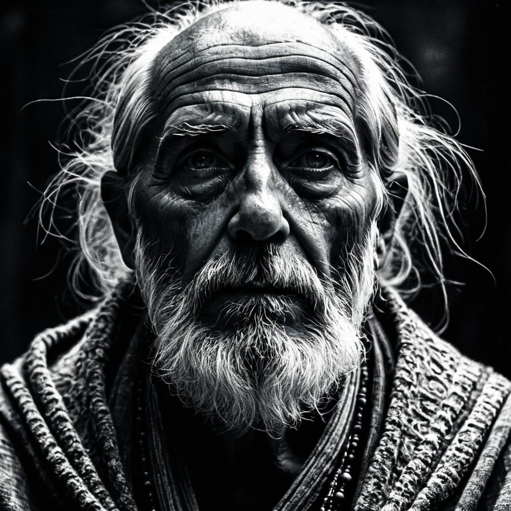 Black and white ultra-realistic close-up portrait of an elderly man with long white hair and beard, wearing a textured robe and beaded necklace. The detailed wrinkles and intense gaze convey a sense of wisdom, foresight, and mysticism. The high contrast lighting enhances the depth and character in his face.